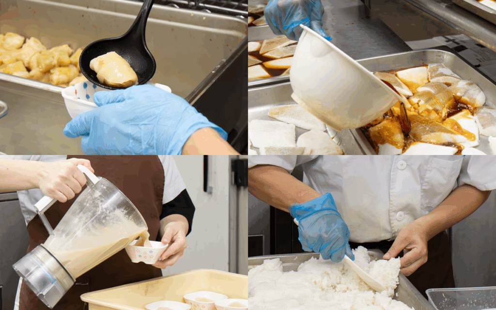 朝早くから仕込みに入り、利用者ごとの食形態や制限食を考え、時間に追われながら盛り付けを進め、衛生管理にも注意が必要です。